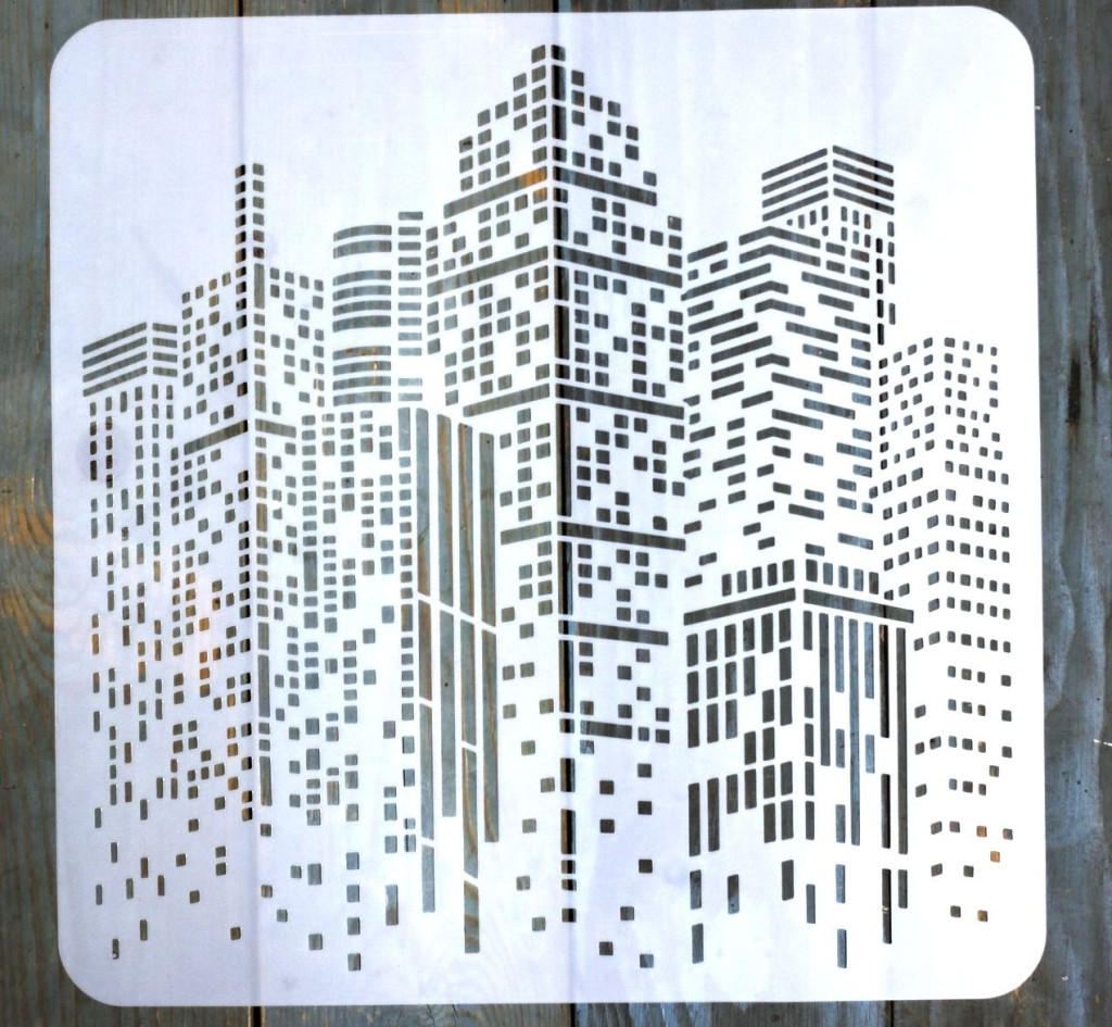 felhőkarcoló, metropolisz mintás műanyag sablon, 30x30 cm-es DIY festő stencil